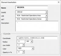 In der militärischen Fliegerei, ist die Nutzung eines Bullseye unumgänglich. Die ACO stellt dieses Element nur als POINT dar. Einige Systeme könnten das Bullseye aber auch als Solches darstellen, wenn es entsprechend umgesetzt wird. Wählt man als SHAPE nicht POINT sondern BULLSEYE erweitert sich die Anzahl der Eingabeparameter.