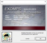 Infobox mit der aktuellen Version von EXOMPS. Mit der Schaltfläche „License“ gelangen Sie zur Verwaltung des Lizenzschlüssels.